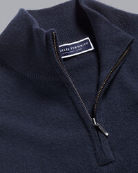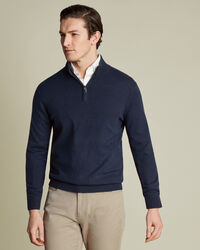 Cashmere Zip Neck Jumper - Navyhttps://www.charlestyrwhitt.com/on/demandware.static/-/Sites-ctshirts-master/default/dw6e29ae3c/hi-res/CT/KNJ0446NAV_MODEL_FRONT.jpgKNJ0446NAVThe cashmere goat is adapted to thrive in challenging conditions, producing a fleece that's light yet warm and naturally able to regulate temperature. Our luxurious cashmere knit takes on all of these winning properties – plus, we've garment washed it for extra softness. Ribbed hems and cuffs help to retain warmth, while the zip neck can be worn open or closed.https://www.charlestyrwhitt.com/au/cashmere-zip-neck-jumper---navy/KNJ0446NAV.htmlAUD149.00OutOfStock4.8030