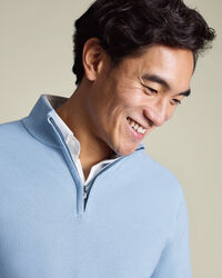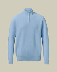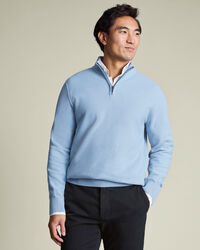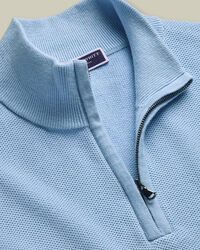Cotton Honeycomb Zip-Neck Jumper – Sky Bluehttps://www.charlestyrwhitt.com/on/demandware.static/-/Sites-ctshirts-master/default/dw0e235155/KNT/KNT0012SKY/KNT0012SKY_MODEL_FRONT_01.jpgKNT0012SKYCrafted from a pure cotton thread and garment washed to give a softer feel, this midweight knit has all-day comfort built in. The honeycomb texture adds subtle depth, while the trophy neck gives it a modern yet refined edge. The yarn is naturally breathable and temperature-regulating, making it an ideal staple in your year-round wardrobe. And did we mention that it can be machine washed? That's every box ticked.https://www.charlestyrwhitt.com/au/cotton-honeycomb-zip-neck-jumper-%E2%80%93-sky-blue/KNT0012SKY.htmlAUD109.00InStock00