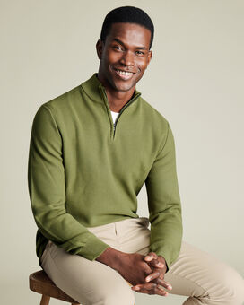 details about product: Honeycomb Cotton Zip Neck Jumper - Moss Green