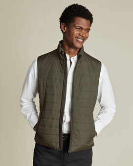 Lightweight Quilted Gilet - Olive Greenhttps://www.charlestyrwhitt.com/on/demandware.static/-/Sites-ctshirts-master/default/dwd98a0762/hi-res/OUC0080OLV_MODEL_FRONT.jpgOUC0080OLVWhen you want to stay warm without working up a sweat, our lighter-weight gilet has you covered. It's designed with a water-resistant polyester shell to shield you from unexpected showers and eco-friendly wadding for that extra snug feel.