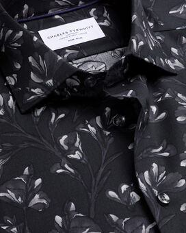 Non-Iron Stretch Floral Print Shirt - Blackhttps://www.charlestyrwhitt.com/on/demandware.static/-/Sites-ctshirts-master/default/dwfaa3455a/SCS/SCS0088BLK/SCS0088BLK_COLLAR_DETAIL_01.jpgSCS0088BLKThere's no better way to add some personality to your tailoring than with our stretch print shirts. They're cut from tactile twill with added stretch for a perfect fit and have a neat, semi-cutaway collar. The split-back yoke allows freedom of movement.