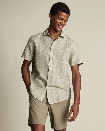 Chemise à motif feuille en coton et lin à manches courtes - Vert saugehttps://www.charlestyrwhitt.com/on/demandware.static/-/Sites-ctshirts-master/default/dwc236efb3/CSM/CSM0030SGE/CSM0030SGE_MODEL_ALT_08.jpgCSM0030SGEIncontournables à la belle saison, ces modèles sont tissés dans un mélange respirant de coton et lin, offrant une sensation de fraîcheur. Ils possèdent une coupe flatteuse et se déclinent dans une sélection exclusive d'imprimés et motifs à rayures, pour un style qui attire tous les regards. Les manches courtes et l'empiècement fendu au dos apportent une sensation de légèreté, tandis que le col classique offre une touche de sophistication. Portez-les avec un short chino et des baskets blanches élégantes pour un look décontracté le week-end.https://www.charlestyrwhitt.com/ca/fr_CA/chemise-%C3%A0-motif-feuille-en-coton-et-lin-%C3%A0-manches-courtes---vert-sauge/CSM0030SGE.htmlCAD189,00InStock00