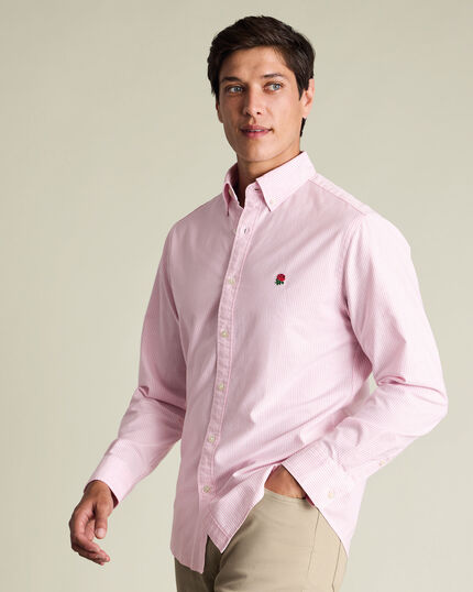 Chemise Oxford délavée England Rugby à rayures en coton à col boutonné - Rosehttps://www.charlestyrwhitt.com/on/demandware.static/-/Sites-ctshirts-master/default/dwb47c119f/CSA/CSA0008PNK/CSA0008PNK_MODEL_UNTUCKED_01.jpgCSA0008PNKSubtilement élégante, polyvalente et particulièrement résistante, cette chemise Oxford délavée extensible est une parfaite coéquipière de votre garde-robe. Fabriquée en coton avec un tissage Oxford épais, elle ne manque pas de prestance. Le délavage lui confère également une douceur et un confort incomparables. Vous apprécierez l’allure décontractée apportée par le col boutonné et les détails caractéristiques Tyrwhitt, comme la bordure contrastée à l’arrière du col.https://www.charlestyrwhitt.com/ca/fr_CA/chemise-oxford-d%C3%A9lav%C3%A9e-england-rugby-%C3%A0-rayures-en-coton-%C3%A0-col-boutonn%C3%A9---rose/CSA0008PNK.htmlCAD199,00InStock00