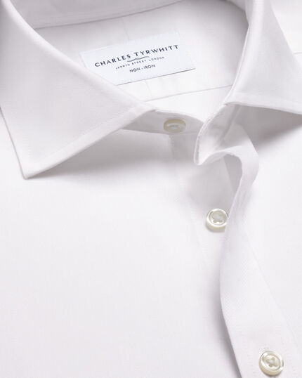 Chemise Col Cutaway Sergé Sans Repassage - Blanchttps://www.charlestyrwhitt.com/on/demandware.static/-/Sites-ctshirts-master/default/dw63a0f5b0/hi-res/FON0540WHT_COLLAR_DETAIL_01.jpgFON0540WHTCette chemise est confectionnée à partir d'un fil de pur coton à 2 brins dans un tissu solide et résistant. D'une douceur absolue sur la peau, ce modèle en sergé est l'un de nos plus appréciés. Bien entendu, il se dote de notre légendaire finition sans repassage, pour vous faire gagner du temps le matin. Nos cinq nouveaux coloris permettent de varier selon l'humeur et la saison. Son épaisseur moyenne en fait également une pièce parfaitement polyvalente. Choisissez entre un col classique ou italien, tous deux munis de baleines en laiton offertes.https://www.charlestyrwhitt.com/ch/fr_CH/chemise-col-cutaway-serg%C3%A9-sans-repassage---blanc/FON0540WHT.htmlCHF119.00InStock