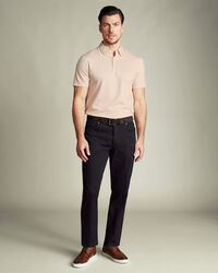 Wir haben 97 % Baumwolle und 3 % Elastan über eine Bürste geschert und beobachtet, wie ein Freizeitklassiker salonfähig wird. Denken Sie an die traditionelle Jeans – nur mit ein bisschen Stretch für mehr Bewegungsfreiheit und eine bequeme Passform sowie bogenförmige Front- und aufgesetzte Gesäßtaschen. Den Unterschied macht das gebürstete Finish des Twill-Gewebes. Denn es sorgt dafür, dass die Modelle nicht nur am Wochenende, sondern auch schon freitags im Büro eine smarte Figur abgeben.