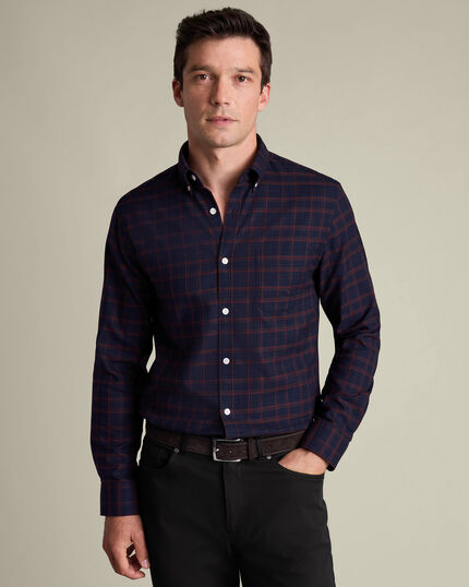 Bügelfreies Twill-Hemd mit Karos - Marineblau & Rostfarbenhttps://www.charlestyrwhitt.com/on/demandware.static/-/Sites-ctshirts-master/default/dw90fa15ca/hi-res/CSC0026NRD_MODEL_TUCKED.jpgCSC0026NRDDas aus reiner, etwas schwererer Baumwolle gefertigte Twill-Gewebe dieses Hemds bietet Ihnen das ganze Jahr über Vielseitigkeit. Zudem ist das Kleidungsstück für einen weicheren Griff vorgewaschen und mit unserem innovativen bügelfreien Finish versehen – weil wohl niemand am Wochenende gern das Bügeleisen schwingt. Auch an Liebe zum Detail fehlt es nicht: Denken Sie an Kontrast-Knopflöcher, einen stabilen Button-down-Kragen und eine linke Brusttasche aus dem gleichen Stoff. Für mühelose Looks krempeln Sie die Ärmel des Hemds hoch und tragen es über dem Hosenbund.https://www.charlestyrwhitt.com/de/buegelfreies-twill-hemd-mit-karos---marineblau-%26-rostfarben/CSC0026NRD.htmlEUR84,95InStock4,7011