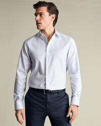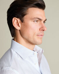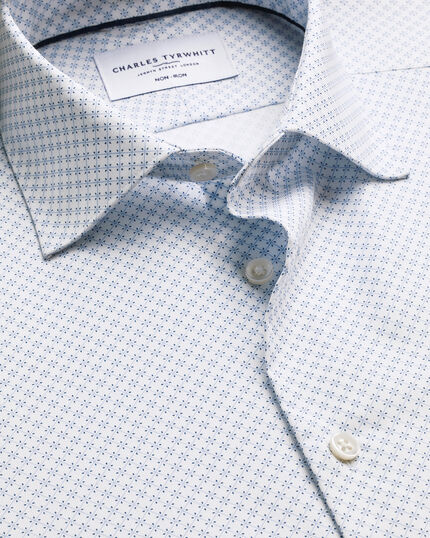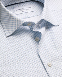 Chemise à imprimé géométrique extensible sans repassage – Blanc et Bleu clairhttps://www.charlestyrwhitt.com/on/demandware.static/-/Sites-ctshirts-master/default/dw620d3871/SCS/SCS0115LBU/SCS0115LBU_COLLAR_DETAIL_01.jpgSCS0115LBUVous ne trouverez pas mieux que nos chemises imprimées pour donner du caractère à votre costume. Confectionnées dans un sergé texturé et extensible, elles présentent une coupe parfaite et un col semi-italien impeccable. L'empiècement fendu au dos offre une grande liberté de mouvement.