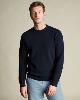 Cotton Rib Crew Neck Jumper - Navyhttps://www.charlestyrwhitt.com/on/demandware.static/-/Sites-ctshirts-master/default/dw83be3e24/hi-res/CT/KNJ0453NAV_MODEL_FRONT.jpgKNJ0453NAVCrafted from 100% cotton, this rib-textured jumper is the answer to all your warm weather layering. Breathable and easy to layer over T-shirts and under jackets, you'll be sorted when the weather takes an unexpected turn for the worse. Wear it on the plane or have it as backup in the office - we can't sing this clever jumper's praises enough.https://www.charlestyrwhitt.com/intl/cotton-rib-crew-neck-jumper---navy/KNJ0453NAV.htmlGBP39.95InStock4.6026