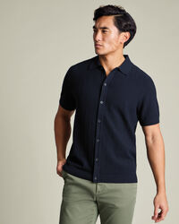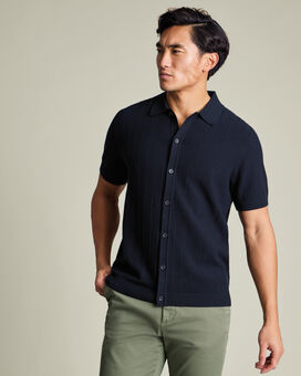 Cotton Stripe Texture Button Through Knitted Polo – Navyhttps://www.charlestyrwhitt.com/on/demandware.static/-/Sites-ctshirts-master/default/dw1505fdad/hi-res/KNT0018NAV_MODEL_FRONT_01.jpgKNT0018NAVCrafted from pure cotton, this polo is naturally breathable and temperature regulating, then garment washed for extra softness. The mid-weight knit feels comfortable all day and has the substance to layer easily under a blazer. A button-through placket gives the style a smarter edge, setting it apart from the usual polo. With a structured collar and ribbed trims that keep their shape, it’s sharp, practical, and built for repeat wear.https://www.charlestyrwhitt.com/intl/cotton-stripe-texture-button-through-knitted-polo-%E2%80%93-navy/KNT0018NAV.htmlGBP69.95InStock00