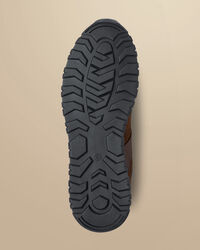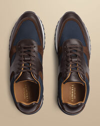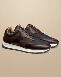 Leather Textile Trainers - Dark Chocolatehttps://www.charlestyrwhitt.com/on/demandware.static/-/Sites-ctshirts-master/default/dw44eedc79/hi-res/SHW0254DCL_SIDE.jpgSHW0254DCLWelcome weekend comfort into your footwear collection with these trainers. The lightweight construction and rubber sole reduces foot fatigue, while the padded Collar and insock provide additional support with every step. The upper is crafted from soft leather, suede and textile. The result? A hard-wearing, versatile shoe for running errands or simply adding a casual touch to your outfit.https://www.charlestyrwhitt.com/intl/leather-textile-trainers---dark-chocolate/SHW0254DCL.htmlGBP89.95OutOfStock4.7029