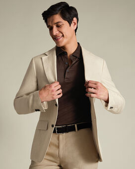 Pure Linen Jacket – Stonehttps://www.charlestyrwhitt.com/on/demandware.static/-/Sites-ctshirts-master/default/dw8f17cfac/SUN/SUN0009STN/SUN0009STN_MODEL_FRONT_01.jpgSUN0009STNOur lightweight, 100% linen suit is built for maximum breathability for a timeless summery look. The suit jacket is spun from pure linen with a lightweight shoulder and canvas, making it an ideal layer for milder weather. It's cut to a single-breasted silhouette with AMF stitching to keep the lapels and pockets neatly in place.https://www.charlestyrwhitt.com/intl/pure-linen-jacket-%E2%80%93-stone/SUN0009STN.htmlGBP319.00InStock51