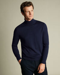 Pure Merino Roll Neck Jumper - Navy https://www.charlestyrwhitt.com/on/demandware.static/-/Sites-ctshirts-master/default/dwc8d24eac/hi-res/CT/KNJ0070NAV_MODEL_FRONT.jpg KNJ0070NAV This refined-yet-casual roll neck is crafted from pure, Woolmark-certified Merino wool. Known as nature's performance fabric, Merino is comfortably breathable and temperature regulating - and has the softest handle of any knitwear. We've gently washed it for an even silkier finish, resulting in a supple jumper that subtly moulds itself to your body.  The styling is simple, letting the fine fibres take centre stage. There's traditional ribbing on the cuffs and hem and the understated neckline means this jumper looks superb when worn with a button-down shirt. https://www.charlestyrwhitt.com/nl/en_NL/pure-merino-roll-neck-jumper---navy/KNJ0070NAV.html EUR 99.95 InStock 4.90 88