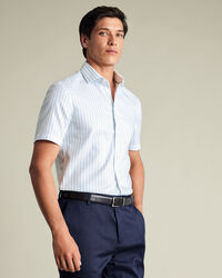 Short Sleeve Cotton Linen Stripe Shirt - Light Bluehttps://www.charlestyrwhitt.com/on/demandware.static/-/Sites-ctshirts-master/default/dw80b0baba/CSM/CSM0030LBU/CSM0030LBU_MODEL_TUCKED_01.jpgCSM0030LBUThese warm-weather essentials are woven from a breathable cotton-linen blend for a cooling feel. They come with a flattering fit and are adorned with a range of exclusive stripes and prints for an eye-catching look. Short sleeves and split back yoke contribute to the breezy feel, while button-down collars deliver a tidy finish. Wear yours with chino shorts and white smart trainers for a laid-back weekend look.https://www.charlestyrwhitt.com/nl/en_NL/short-sleeve-cotton-linen-stripe-shirt---light-blue/CSM0030LBU.htmlEUR84.95InStock00