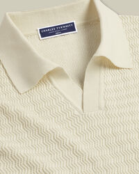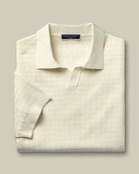 Katoen Polo Met Trofeekraag En Gewoven - Crèmehttps://www.charlestyrwhitt.com/on/demandware.static/-/Sites-ctshirts-master/default/dw573022ad/hi-res/KNITWEAR/CT/KNT0005CRM_MODEL_FRONT.jpgKNT0005CRMLook effortlessly polished during the transitional season in this short-sleeved polo.