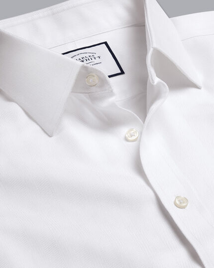 A crisp, white shirt can be the making of a smart suit-and-tie ensemble. With this best-selling style's intricate herringbone twill, enjoy an extra level of sophistication that will complement any formal outfit. Our non-iron finish makes it easy and quick to care for – simply wash and hang. The classic collar is an effortless option for a neat and streamlined look. Our complimentary brass collar stiffeners keep the points in place, wear after wear.