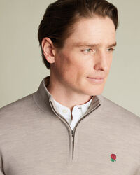 England Rugby Pure Merino Half Zip Jumper - Limestonehttps://www.charlestyrwhitt.com/on/demandware.static/-/Sites-ctshirts-master/default/dw30790979/hi-res/KNQ0002LST_MODEL_FRONT.jpgKNQ0002LSTInnovative fibres wick away moisture to regulate your temperature, keeping you comfortable and dry. Our EcoMade fabric provides the reliable cooling performance you expect and is made from 100% textile waste or recycled bottles.