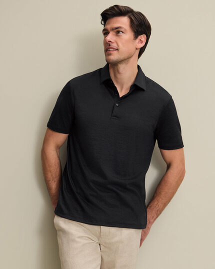 Linen Polo - Black https://www.charlestyrwhitt.com/on/demandware.static/-/Sites-ctshirts-master/default/dw45f1cd29/hi-res/JEP0473BLK_MODEL_UNTUCKED_06.jpg JEP0473BLK Made from durable flax fibres, the pure linen fabric is highly absorbent and dries quickly, making it ideal for hot and humid days. It features a smart semi-cutaway collar that's secured by a classic three-button placket. For a relaxed weekend get-up, throw it on with Twill 5 Pocket Jeans and your favourite trainers. As for a night on the town? Wear yours with slim-fitting chinos and brogues to instantly smarten up your look. https://www.charlestyrwhitt.com/uk/linen-polo---black/JEP0473BLK.html GBP 64.95 InStock 0 0