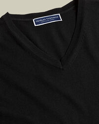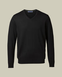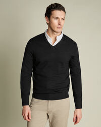Merino V-Neck Jumper - Blackhttps://www.charlestyrwhitt.com/on/demandware.static/-/Sites-ctshirts-master/default/dwb694e459/hi-res/CT/KNJ0066BLK_MODEL_FRONT.jpgKNJ0066BLKThis refined-yet-casual V-neck is crafted from pure, Woolmark-certified Merino wool. Known as nature's performance fabric, Merino is comfortably breathable and temperature regulating - and has the softest handle of any knitwear. We've gently washed it for an even silkier finish, resulting in a supple jumper that subtly moulds itself to your body.