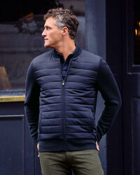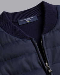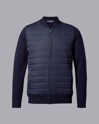 Merino Zip Through Hybrid Bomber Jacket - Navyhttps://www.charlestyrwhitt.com/on/demandware.static/-/Sites-ctshirts-master/default/dw8fd56abb/hi-res/KNC0086NAV_MODEL_FRONT.jpgKNC0086NAVWhen the weather cools, make our hybrid bomber jacket your go-to outer layer. It's crafted from extra-fine Merino wool for natural breathability and warmth, as well as a refined appearance. We've garment washed it for an exceptionally soft and luxurious feel. The dark navy shade ensures this jumper-meets-jacket looks classic, while quilting on the front is a contemporary twist. Zip it up to the top to stay cosy, allowing just the right amount of your tailored shirt to peek out from underneath.https://www.charlestyrwhitt.com/uk/merino-zip-through-hybrid-bomber-jacket---navy/KNC0086NAV.htmlGBP99.95OutOfStock00