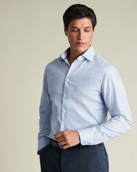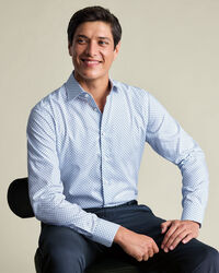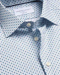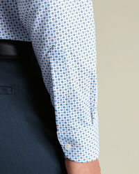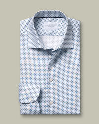 Non-Iron Stretch Print Shirt - White & Bluehttps://www.charlestyrwhitt.com/on/demandware.static/-/Sites-ctshirts-master/default/dwc2b46c15/SCS/SCS0115BLU/SCS0115BLU_COLLAR_DETAIL_01.jpgSCS0115BLUThere's no better way to add some personality to your tailoring than with our stretch print shirts. They're cut from tactile twill with added stretch for a perfect fit and have a neat, semi-cutaway collar. The split-back yoke allows freedom of movement.