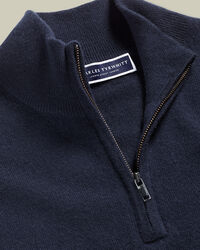 Pure Cashmere Half Zip Jumper - Navyhttps://www.charlestyrwhitt.com/on/demandware.static/-/Sites-ctshirts-master/default/dw924a8d33/hi-res/KNS0004NAV_MODEL_FRONT.jpgKNS0004NAVThe cashmere goat is adapted to thrive in challenging conditions, producing a fleece that's light yet warm and naturally able to regulate temperature. Our luxurious cashmere knit takes on all of these winning properties – plus, we've garment washed it for extra softness. Ribbed hems and cuffs help to retain warmth, while the zip neck can be worn open or closed.https://www.charlestyrwhitt.com/uk/pure-cashmere-half-zip-jumper---navy/KNS0004NAV.htmlGBP179.00InStock52
