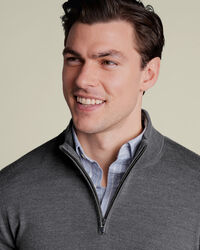 Pure Merino Half Zip Jumper - Grey https://www.charlestyrwhitt.com/on/demandware.static/-/Sites-ctshirts-master/default/dw15c76836/hi-res/CT/KNJ0432GRY_MODEL_FRONT.jpg KNJ0432GRY Known as nature's performance fabric, Merino is comfortably breathable and temperature regulating - and has the softest handle of any knitwear. We've gently washed it for an even silkier finish, resulting in a supple jumper that subtly moulds itself to your body. The styling is simple, letting the fine fibres take centre stage. There's traditional ribbing on the cuffs and hem and the understated neckline means this jumper looks superb when worn with a button-down shirt. https://www.charlestyrwhitt.com/uk/pure-merino-half-zip-jumper---grey/KNJ0432GRY.html GBP 79.95 InStock 4.80 130