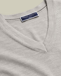 Pure Merino V-Neck Jumper - Silver Greyhttps://www.charlestyrwhitt.com/on/demandware.static/-/Sites-ctshirts-master/default/dw1f56ff0e/hi-res/KNM0008SLV_MODEL_FRONT.jpgKNM0008SLVWe’ve updated our bestselling knit with a modern neck that’s deeper and more defined for a cleaner, contemporary look. Spun from Woolmark-certified Merino wool, this jumper is breathable, naturally breathable, temperature regulating and exceptionally soft. The gentle wash gives it a silky finish that moves with you. Traditional ribbed cuffs and hem keep things polished, while the understated style works effortlessly over a collared shirt.https://www.charlestyrwhitt.com/uk/pure-merino-v-neck-jumper---silver-grey/KNM0008SLV.htmlGBP79.95InStock4.808