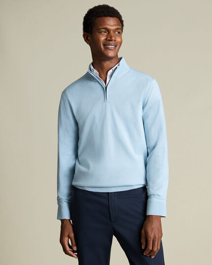 Pure Merino Zip-Neck Jumper – Blue https://www.charlestyrwhitt.com/on/demandware.static/-/Sites-ctshirts-master/default/dw9a2fc09f/KNM/KNM0015CEB/KNM0015CEB_MODEL_FRONT_01.jpg KNM0015CEB Known as nature's performance fabric, Merino is comfortably breathable and temperature regulating - and has the softest handle of any knitwear. We've gently washed it for an even silkier finish, resulting in a supple jumper that subtly moulds itself to your body. The styling is simple, letting the fine fibres take centre stage. There's traditional ribbing on the cuffs and hem and the understated neckline means this jumper looks superb when worn with a button-down shirt. https://www.charlestyrwhitt.com/uk/pure-merino-zip-neck-jumper-%E2%80%93-blue/KNM0015CEB.html GBP 79.95 InStock 0 0