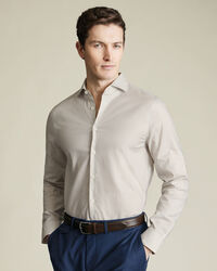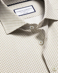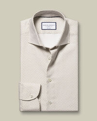 Non-Iron Stretch Geo Print Shirt - Taupe & Bluehttps://www.charlestyrwhitt.com/on/demandware.static/-/Sites-ctshirts-master/default/dwb5d968b8/hi-res/FORMAL_SHIRTS/CT/FOB0794TPE_COLLAR_DETAIL.jpgFOB0794TPEThere's no better way to add some personality to your tailoring than with our stretch print shirts. They're cut from tactile twill with added stretch for a perfect fit and have a neat, semi-spread collar. The split-back yoke allows freedom of movement.